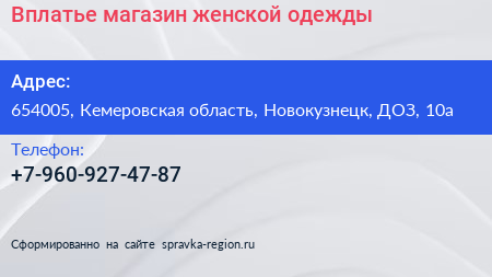 Вплатье, магазин женской одежды по адресу 654005, Кемеровская область, Новокузнецк, ДОЗ, 10а в дальнейшем Организация, размещена в следующих категориях: