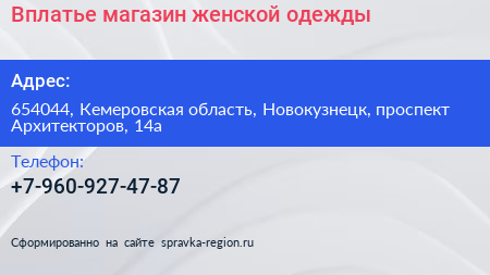 Вплатье, магазин женской одежды по адресу 654044, Кемеровская область, Новокузнецк, проспект Архитекторов, 14а в дальнейшем Организация, размещена в следующих категориях: