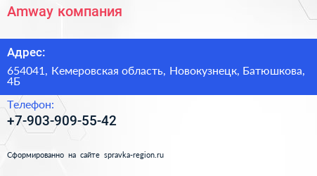 Amway, компания по адресу 654041, Кемеровская область, Новокузнецк, Батюшкова, 4Б в дальнейшем Организация, размещена в следующих категориях:
