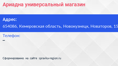 Ариадна, универсальный магазин по адресу 654086, Кемеровская область, Новокузнецк, Новаторов, 15 в дальнейшем Организация, размещена в следующих категориях: