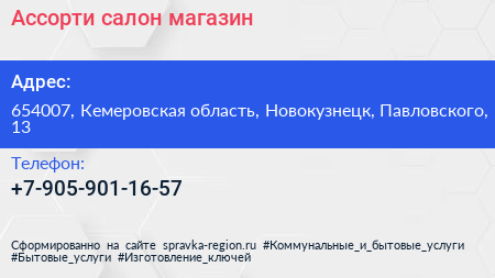 Ассорти, салон-магазин по адресу 654007, Кемеровская область, Новокузнецк, Павловского, 13 в дальнейшем Организация, размещена в следующих категориях: