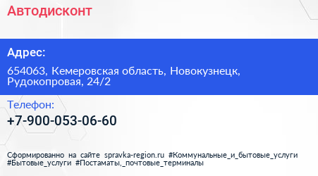 Автодисконт по адресу 654063, Кемеровская область, Новокузнецк, Рудокопровая, 24/2 в дальнейшем Организация, размещена в следующих категориях:
