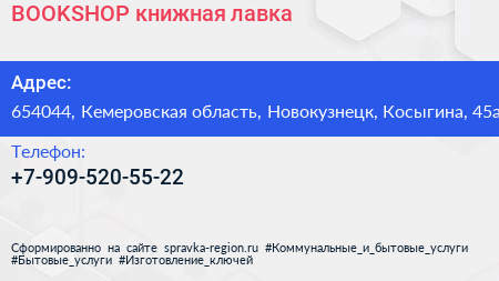 BOOKSHOP, книжная лавка по адресу 654044, Кемеровская область, Новокузнецк, Косыгина, 45а в дальнейшем Организация, размещена в следующих категориях:
