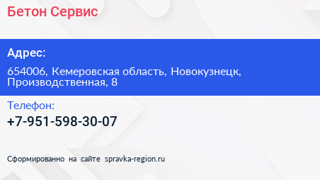 Бетон Сервис по адресу 654006, Кемеровская область, Новокузнецк, Производственная, 8 в дальнейшем Организация, размещена в следующих категориях: