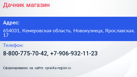 Дачник, магазин по адресу 654031, Кемеровская область, Новокузнецк, Ярославская, 17 в дальнейшем Организация, размещена в следующих категориях:
