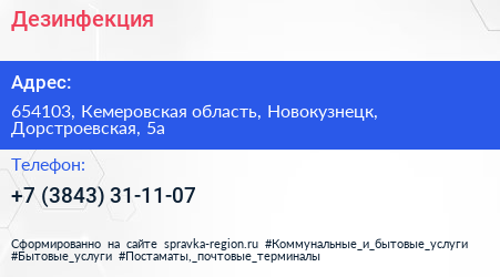 Дезинфекция по адресу 654103, Кемеровская область, Новокузнецк, Дорстроевская, 5а в дальнейшем Организация, размещена в следующих категориях: