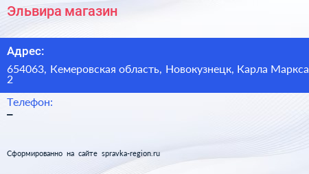 Эльвира, магазин по адресу 654063, Кемеровская область, Новокузнецк, Карла Маркса, 2 в дальнейшем Организация, размещена в следующих категориях: