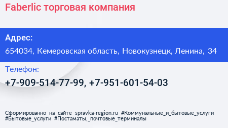Faberlic, торговая компания по адресу 654034, Кемеровская область, Новокузнецк, Ленина, 34 в дальнейшем Организация, размещена в следующих категориях: