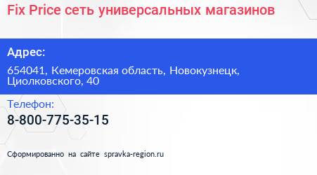 Fix Price, сеть универсальных магазинов по адресу 654041, Кемеровская область, Новокузнецк, Циолковского, 40 в дальнейшем Организация, размещена в следующих категориях:
