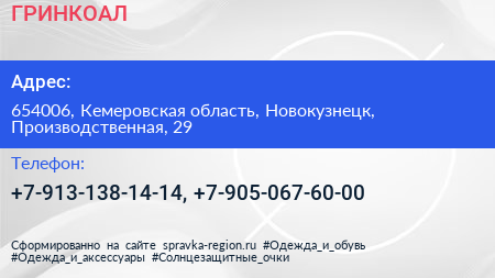 ГРИНКОАЛ по адресу 654006, Кемеровская область, Новокузнецк, Производственная, 29 в дальнейшем Организация, размещена в следующих категориях: