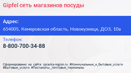 Gipfel, сеть магазинов посуды по адресу 654005, Кемеровская область, Новокузнецк, ДОЗ, 10а в дальнейшем Организация, размещена в следующих категориях: