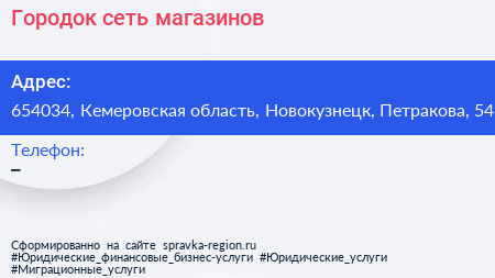 Городок, сеть магазинов по адресу 654034, Кемеровская область, Новокузнецк, Петракова, 54 в дальнейшем Организация, размещена в следующих категориях: