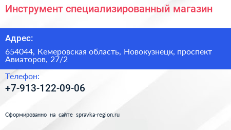 Инструмент, специализированный магазин по адресу 654044, Кемеровская область, Новокузнецк, проспект Авиаторов, 27/2 в дальнейшем Организация, размещена в следующих категориях: