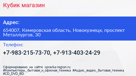 Кубик, магазин по адресу 654007, Кемеровская область, Новокузнецк, проспект Металлургов, 30 в дальнейшем Организация, размещена в следующих категориях: