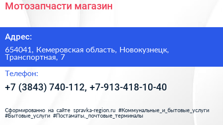 Мотозапчасти, магазин по адресу 654041, Кемеровская область, Новокузнецк, Транспортная, 7 в дальнейшем Организация, размещена в следующих категориях: