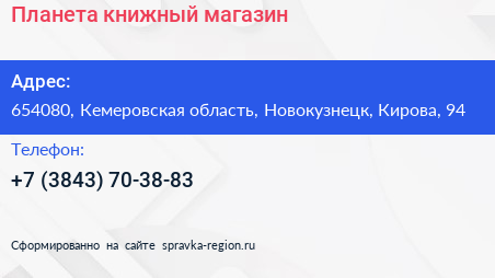 Планета, книжный магазин по адресу 654080, Кемеровская область, Новокузнецк, Кирова, 94 в дальнейшем Организация, размещена в следующих категориях:
