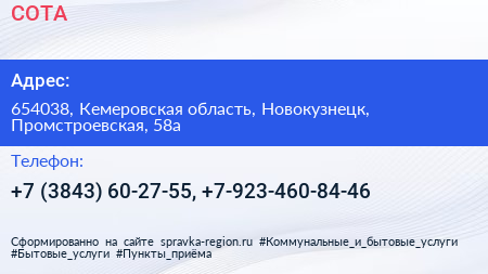 СОТА по адресу 654038, Кемеровская область, Новокузнецк, Промстроевская, 58а в дальнейшем Организация, размещена в следующих категориях: