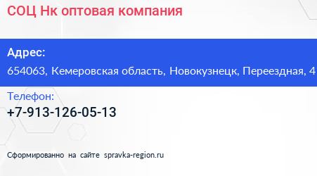 СОЦ Нк, оптовая компания по адресу 654063, Кемеровская область, Новокузнецк, Переездная, 4 в дальнейшем Организация, размещена в следующих категориях: