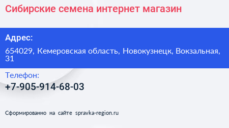 Сибирские семена, интернет-магазин по адресу 654029, Кемеровская область, Новокузнецк, Вокзальная, 31 в дальнейшем Организация, размещена в следующих категориях: