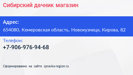 Сибирский дачник, магазин по адресу 654080, Кемеровская область, Новокузнецк, Кирова, 82 в дальнейшем Организация, размещена в следующих категориях: