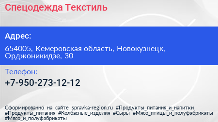 Спецодежда-Текстиль по адресу 654005, Кемеровская область, Новокузнецк, Орджоникидзе, 30 в дальнейшем Организация, размещена в следующих категориях: