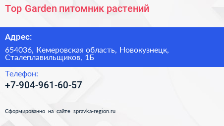 Top Garden, питомник растений по адресу 654036, Кемеровская область, Новокузнецк, Сталеплавильщиков, 1Б в дальнейшем Организация, размещена в следующих категориях: