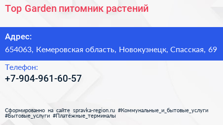 Top Garden, питомник растений по адресу 654063, Кемеровская область, Новокузнецк, Спасская, 69 в дальнейшем Организация, размещена в следующих категориях: