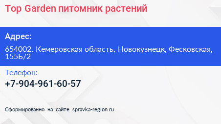 Top Garden, питомник растений по адресу 654002, Кемеровская область, Новокузнецк, Фесковская, 155Б/2 в дальнейшем Организация, размещена в следующих категориях: