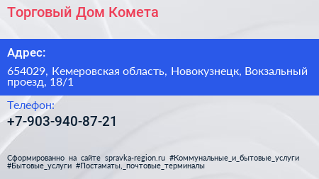 Торговый Дом Комета по адресу 654029, Кемеровская область, Новокузнецк, Вокзальный проезд, 18/1 в дальнейшем Организация, размещена в следующих категориях: