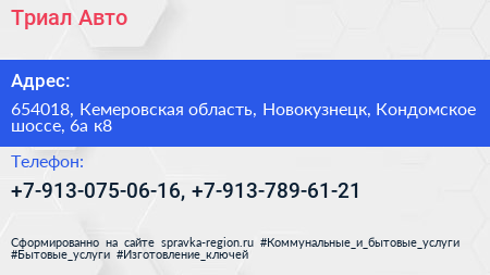 Триал-Авто по адресу 654018, Кемеровская область, Новокузнецк, Кондомское шоссе, 6а к8 в дальнейшем Организация, размещена в следующих категориях: