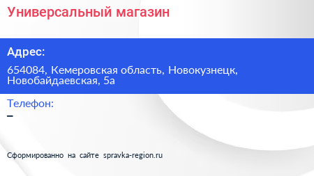 Универсальный магазин по адресу 654084, Кемеровская область, Новокузнецк, Новобайдаевская, 5а в дальнейшем Организация, размещена в следующих категориях: