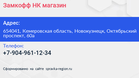 Замкофф НК, магазин по адресу 654041, Кемеровская область, Новокузнецк, Октябрьский проспект, 60а в дальнейшем Организация, размещена в следующих категориях: