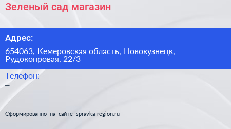Зеленый сад, магазин по адресу 654063, Кемеровская область, Новокузнецк, Рудокопровая, 22/3 в дальнейшем Организация, размещена в следующих категориях:
