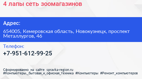 4 лапы, сеть зоомагазинов по адресу 654005, Кемеровская область, Новокузнецк, проспект Металлургов, 46 в дальнейшем Организация, размещена в следующих категориях: