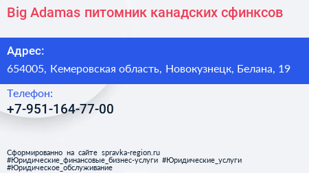 Big Adamas, питомник канадских сфинксов по адресу 654005, Кемеровская область, Новокузнецк, Белана, 19 в дальнейшем Организация, размещена в следующих категориях: