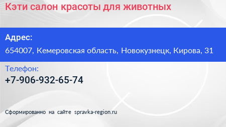 Кэти, салон красоты для животных по адресу 654007, Кемеровская область, Новокузнецк, Кирова, 31 в дальнейшем Организация, размещена в следующих категориях: