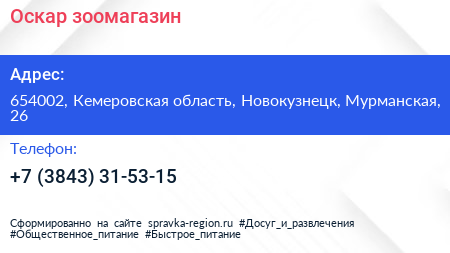 Оскар, зоомагазин по адресу 654002, Кемеровская область, Новокузнецк, Мурманская, 26 в дальнейшем Организация, размещена в следующих категориях: