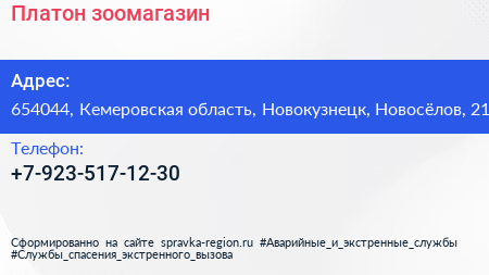 Платон, зоомагазин по адресу 654044, Кемеровская область, Новокузнецк, Новосёлов, 21 в дальнейшем Организация, размещена в следующих категориях:
