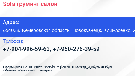 Sofa, груминг-салон по адресу 654038, Кемеровская область, Новокузнецк, Климасенко, 2 в дальнейшем Организация, размещена в следующих категориях: