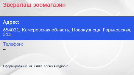 Звералаш, зоомагазин по адресу 654031, Кемеровская область, Новокузнецк, Горьковская, 31а в дальнейшем Организация, размещена в следующих категориях: