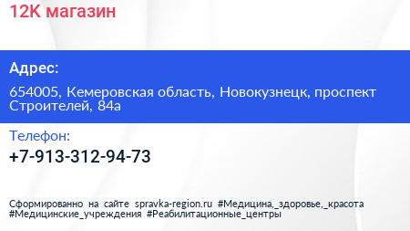 12K, магазин по адресу 654005, Кемеровская область, Новокузнецк, проспект Строителей, 84а в дальнейшем Организация, размещена в следующих категориях: