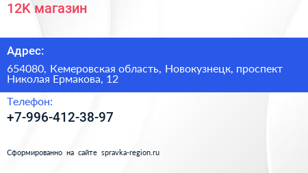 12K, магазин по адресу 654080, Кемеровская область, Новокузнецк, проспект Николая Ермакова, 12 в дальнейшем Организация, размещена в следующих категориях: