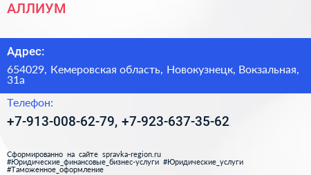 АЛЛИУМ по адресу 654029, Кемеровская область, Новокузнецк, Вокзальная, 31а в дальнейшем Организация, размещена в следующих категориях: