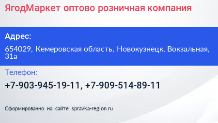 ЯгодМаркет, оптово-розничная компания по адресу 654029, Кемеровская область, Новокузнецк, Вокзальная, 31а в дальнейшем Организация, размещена в следующих категориях: