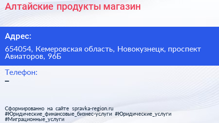 Алтайские продукты, магазин по адресу 654054, Кемеровская область, Новокузнецк, проспект Авиаторов, 96Б в дальнейшем Организация, размещена в следующих категориях: