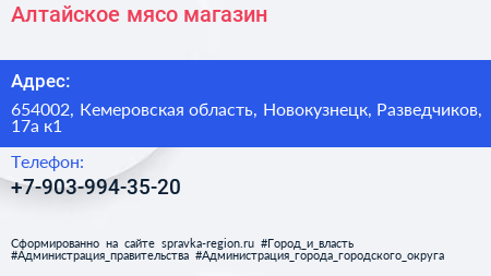 Алтайское мясо, магазин по адресу 654002, Кемеровская область, Новокузнецк, Разведчиков, 17а к1 в дальнейшем Организация, размещена в следующих категориях: