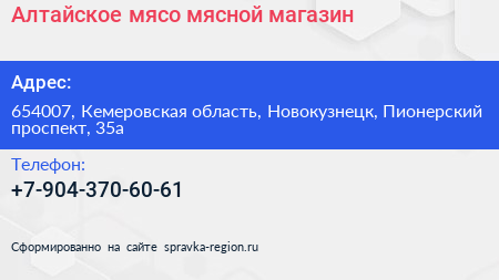 Алтайское мясо, мясной магазин по адресу 654007, Кемеровская область, Новокузнецк, Пионерский проспект, 35а в дальнейшем Организация, размещена в следующих категориях: