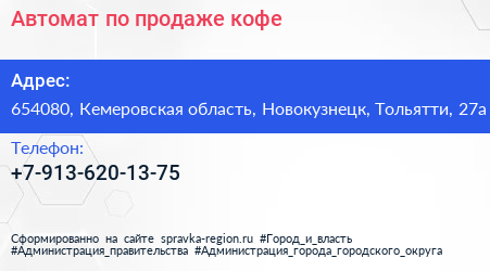 Автомат по продаже кофе по адресу 654080, Кемеровская область, Новокузнецк, Тольятти, 27а в дальнейшем Организация, размещена в следующих категориях:
