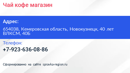 Чай кофе, магазин по адресу 654038, Кемеровская область, Новокузнецк, 40 лет ВЛКСМ, 40Б в дальнейшем Организация, размещена в следующих категориях: