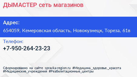 ДЫМАСТЕР, сеть магазинов по адресу 654059, Кемеровская область, Новокузнецк, Тореза, 61в в дальнейшем Организация, размещена в следующих категориях:
